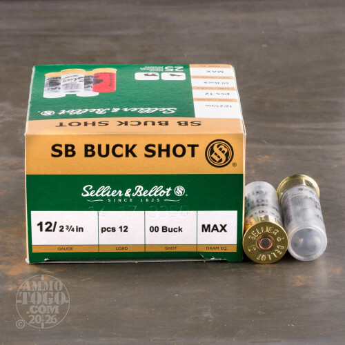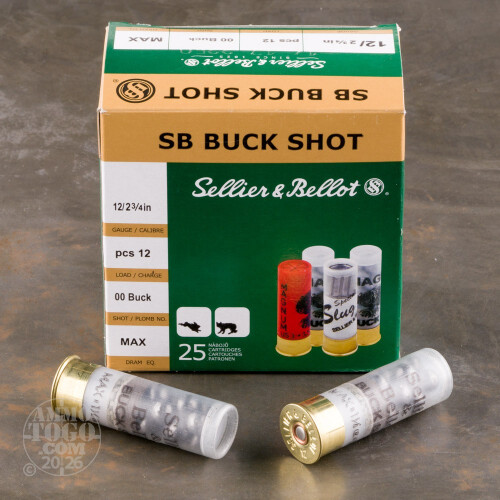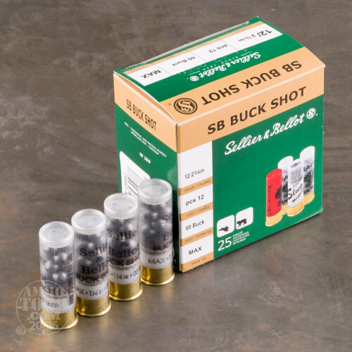 This 12 gauge buckshot load from Sellier & Bellot features a high pellet count for improved hit probability against deer and other game. Each 2-3/4" shell in this box of 25 fires 12 pellets of 00 buckshot at a muzzle velocity of 1,180 feet per second. This reduced velocity serves to slightly reduce the risk of over-penetration, making this a viable self-defense load in some areas. This ammunition is loaded in the Czech Republic.-