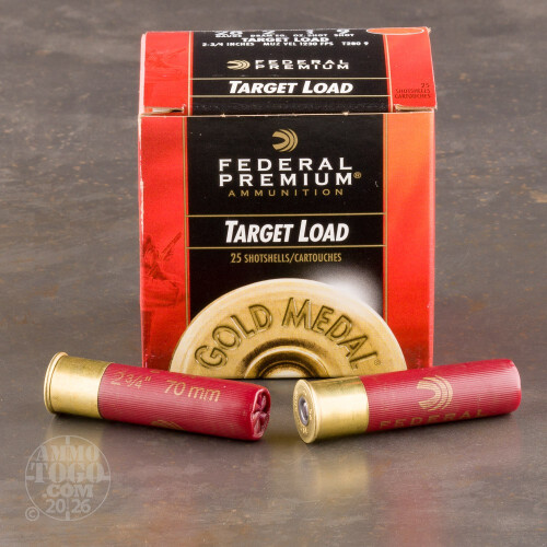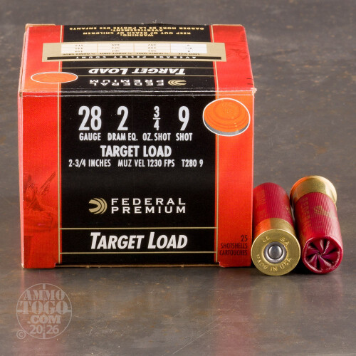 This is 28 Gauge Federal Gold Medal Target 2 3/4" 3/4oz. #9. Federal Premium Gold Medal Plastic Target Shotshells provide optimum performance in all clay target disciplines. These target loads feature tournament grade components, consistent velocities, and uniform patterns which deliver hard hitting, target breaking performance. Muzzle velocity is 1230 fps. This ammo is packed in 25rd. boxes.