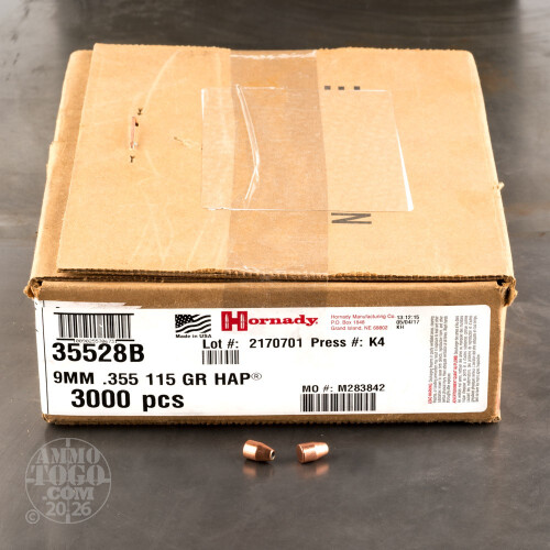 3000pcs - 9mm .355" Dia Hornady HAP 115gr. JHP Bullets Details