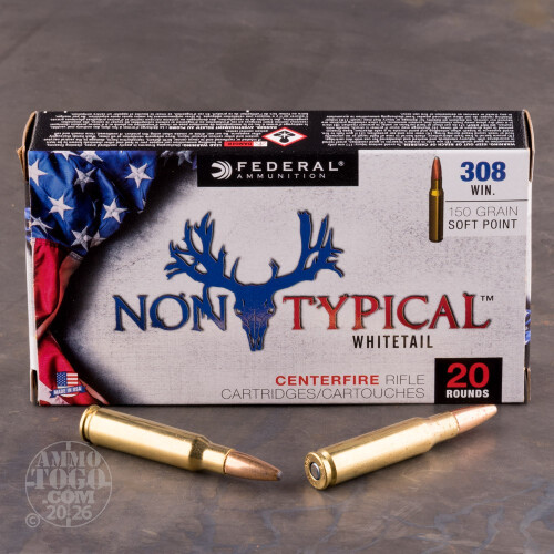 These .308 Winchester rounds from Federal's new "Non-Typical" brand are a splendid choice for deer hunting. Each of these cartridges is crowned with a 150-grain soft point bullet. The projectile features a sleek ogive, a uniform copper jacket, and an optimized lead tip which feeds seamlessly in bolt-action rifles as well as gas guns and dependably expands during entry into a game animal. This mushrooming expansion not only cuts a free-bleeding channel into the deer but ensures optimal transfer of kinetic energy into the vital organs.As a result, hunters can expect clean drops with reduced risk of shoot-throughs and long chases. Each projectile is firmly secured into a brass case that has been precisely drawn for the task. The reloadable casing uses a non-corrosive Boxer primer. Federal Premium ammunition is produced in Minnesota and supported by nearly a century of experience in supplying the most demanding shooters in the United States.