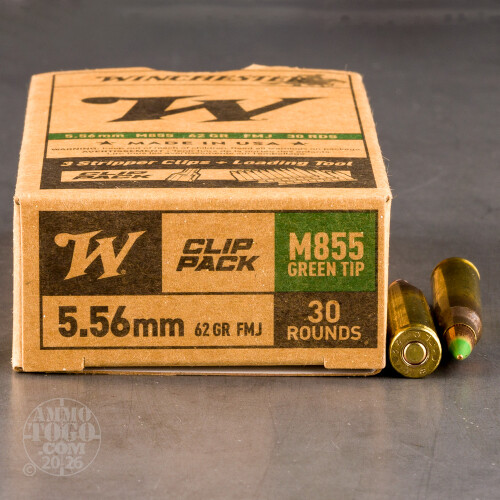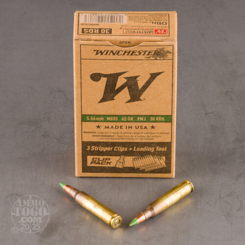 30rds – 5.56x45 Winchester 62gr. FMJ M855 Ammo on Stripper Clips With Loader