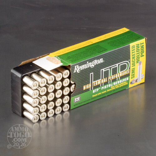 Remington's High Terminal Performance (HTP) cartridges are an excellent choice for self-defense when you're on a budget but don't want to sacrifice quality or dependable function. Each of these .357 Magnum rounds comprises a reloadable brass casing equipped with a non-corrosive Boxer primer and filled with clean-burning propellant. That amalgamation is topped off with a classic semi-jacketed hollow point (SJHP) projectile which is designed for expansion as a duty, hunting, and personal defense implement.This performance is made possible by a hollow cavity carved into a soft nose of exposed lead. The rest of the body is jacketed in gilding metal which prevents the round from expanding prematurely during target entry. A heavy weight of 180-grains ensures serious momentum transfer when the bullet expands and comes to a stop in a target, yielding a more effective stop. The heavy weight also translates to a longer body which lends greater surface area to rifling and produces tighter accuracy with long barrels. Remington design the HTP lineup with knowledge gained from over 200 years of manufacturing firearms, designing calibers, and constantly refining ammunition.