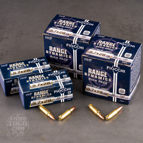 You want supersonic 5.7x28 range ammunition for your Ruger-5.7 or FN Five-seveN! But you also want subsonic 5.7x28 range ammunition for the same pistol. That would be quite the predicament – if you hadn’t happened across this convenient combo pack by Fiocchi, that is!This case of ammo actually contains two different types of cartridges. One is loaded with a 40 grain full metal jacket, which achieves 1,700 fps muzzle velocity out of a 4” test barrel. The other is loaded with a 62 grain full metal jacket, which is heavy enough to secure a 1,050 fps muzzle velocity – over 50 fps lower than the speed of sound, and accordingly quite quiet on ignition. It’s ideal if you want low recoil, or if you’ve got a nice little suppressor that you’d like to test out!