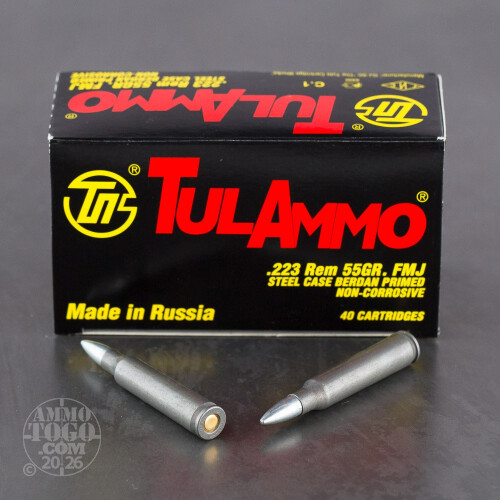 This Tula 223 Rem ammunition is made for high volume range training and cheap plinking. It features a 55 grain full metal jacket bullet, which is best used at the range. This ammo uses cost effective polymer coated steel cases and reliable Berdan primers, which provide consistent performance and save you money! These rounds are non-corrosive and non-reloadable. They come in boxes of 40 rounds and are manufactured in in Russia.Tula Cartridge Works is based in Tula, Russia. The produce large quantities of steel cased ammunition for a variety of calibers, including traditional Russian calibers and western calibers. Steel cased ammunition is used over brass ammunition as a cost saving measure, which became popular in the early part of the 20th century.
