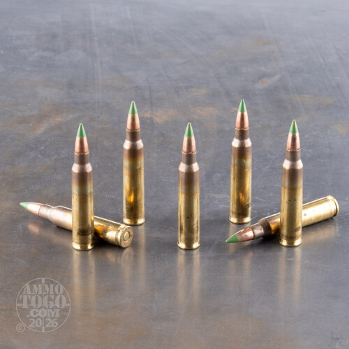 These are XM855 cartridges from Federal’s American Eagle line of ammunition, which are frequently more descriptively called “penetrators.” They owe their ability to easily pierce obstacles such as sheet metal or auto glass to their 62 grain bullets’ steel tips, which are painted green to prevent confusion. The XM855’s bullet will not expand as it enters a soft target, but it will fragment under the right circumstances, and its boat tail design amplifies its ballistic coefficient so that it can deliver a flatter trajectory.Four hundred twenty XM855 cartridges are a good thing to stow away whether you would count on them for self-defense one day or you eventually get the opportunity to plink with the aid of a junker car. In either event, you can count on the steel ammo can that Federal packages these rounds in to keep them safe from corrosive water and other contaminants until you’re ready for them. These rounds’ casings offer even greater value, as they are made of brass and perfect for the reloading press.