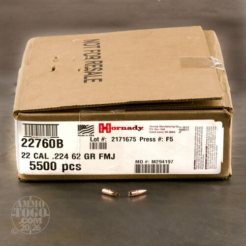500pcs - 22 Cal .224" Dia Hornady 62gr. FMJ Bullets Details