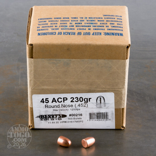500pcs - 45 ACP .452" Dia Berry's 230gr. Plated RN Bullets Details