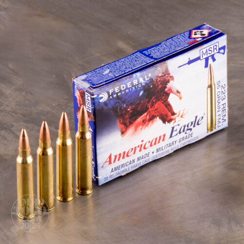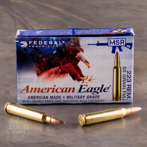 This is Federal American Eagle .223 55gr. Full Metal Jacket Ammo. This ammo is brass cased, boxer primed, and 100% non-corrosive. This is new factory fresh ammo. This ammo is accurate, clean, and reliable. This ammo comes packed in 20rd. boxes, 500rds. per case.