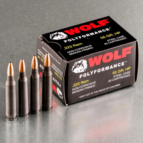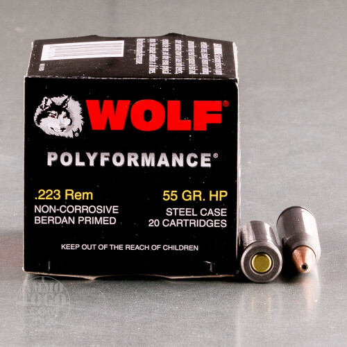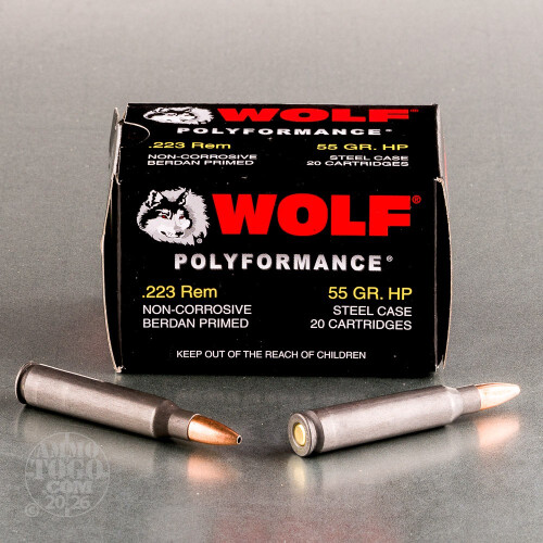 Varmint and target shooters will appreciate the low cost and reliable performance of Wolf Polyformance ammunition in .223 Remington. Ideal for AR-15s, Mini-14s, and other .223/5.56 NATO rifles, these cartridges fire a 55 grain hollow point bullet that delivers lethal fragmentation against small to midsize pest animals. Expect external ballistics comparable to those of M193 ball ammo. Wolf ammunition is loaded in Russia using non-corrosive Berdan primers and polymer-coated non-reloadable steel cases.-