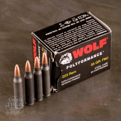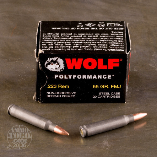 This 500-round bulk pack of .223 Remington from Wolf is an excellent way to store ammo away from the elements. Each case comes packed in a sealed "spam can" case of classic Eastern Bloc military origin. This metal box protects the cartridges from moisture, pests, and rough handling during transport. Wolf, an American company, is able to obtain this ammunition via their partnership with factories in Russia and Ukraine which use equipment that has been trusted to supply military forces for decades.Each cartridge is manufactured using a non-reloadable steel case affixed with a non corrosive Berdan primer. This material selection helps keeps costs down and passes meaningful savings to the shooter. The round is topped with a 55-grain full metal jacket (FMJ) projectile which matches the vast majority of lightweight practice loads in both 5.56mm NATO and .223 Rem. The bi-metal jacketed bullet is great for target use, high round-count drills, and recreational shooting outdoors.