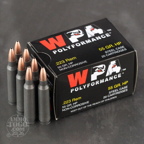 This is .223 WPA 55gr hollow point ammo. This ammo has the polymer steel case and is non-corrosive. This is good plinking ammo. It has an all copper jacketed bullet, so a magnet will not stick to the bullet itself. It comes packed in 20 rd. boxes, 1000rds. per case.