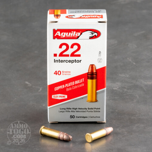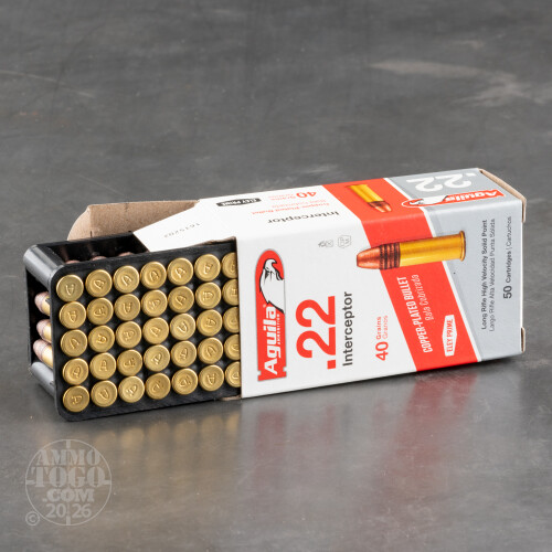 This is Aguila Interceptor .22 Long Rifle 40gr. Solid Point Ammo. This ammo travels at a screaming 1470 feet per second. This is the fastest .22LR 40gr. load available it is 35 FPS faster than CCI Velocitor. It is packed in 50rd boxes, 500rds per brick.