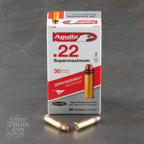 This is Aguila .22 Long Rifle Super Max Hyper Velocity Solid Point Ammo. This ammo has a 30gr. copper coated lead solid point bullet that travels at 1750 FPS at the muzzle. This is the fastest .22LR money can buy. It comes packed in 50rd. boxes, 500rds. per brick.