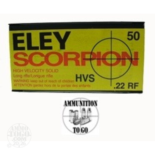 This is .22 LR Eley 40gr. Scorpion Hi-Velocity Solid Point Ammo. This ammo is discontinued and no longer available to most dealers. However, we were offered small number of boxes and are now able to offer them to you. This is sought after ammo and since it is discontinued it is hard to find. Don't miss out on the chance to buy this while it is available! This ammo comes packed in 50 round plastic cases.