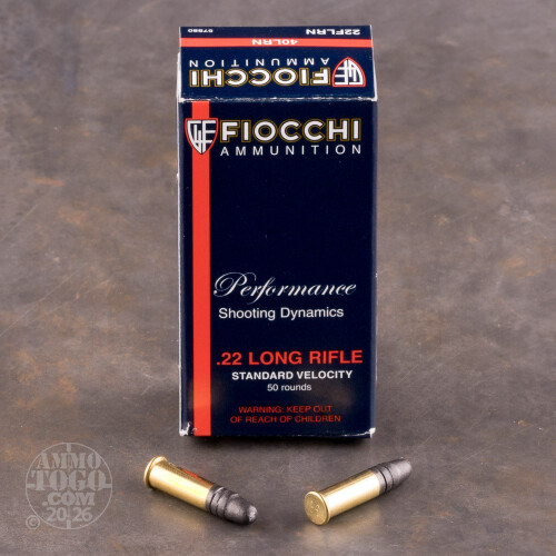 This is .22 Long Rifle Fiocchi Standard Velocity Lead Round Nose Ammo. This ammo is a great choice for target practice or small game hunting. It is non-corrosive and is new production ammo. It has a muzzle velocity of 1070fps. This ammo comes in 50rd boxes and 5000rd cases.