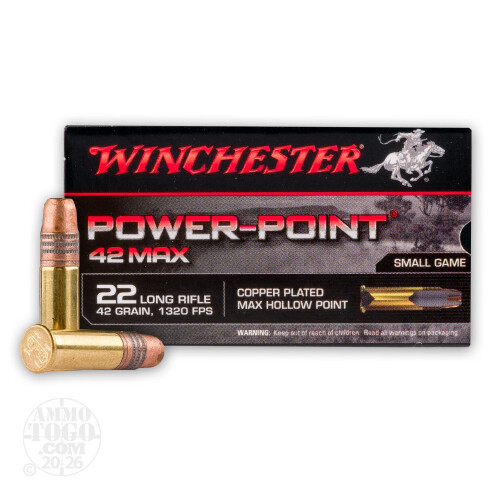 This is 22LR Winchester Power-Point 42 Max Copper Plated Hollow Point Ammo. Winchester Power-Point is the high velocity rimfire brand people trust for accuracy, lethality, and proven performance. Made for hunters and shooters of all types, Power-Point helps ensure success, time after time. This ammo comes packaged 50rds to a box, 500rds to brick. Muzzle Velocity: 1320 FPS.