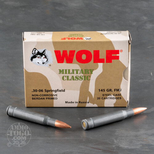 This is .30-06 Wolf Performance Ammunition Military Classic 145gr. Full Metal Jacket Ammo. This ammo has a polymer steel case and is 100% non-corrosive, berdan primed. Economically priced ammunition for high volume shooting. Designed for reliable ignition and functioning in adverse conditions. Polymer coating ensures smooth feeding and extraction. This ammo is packed in 20rd. boxes, 500rds. per case.