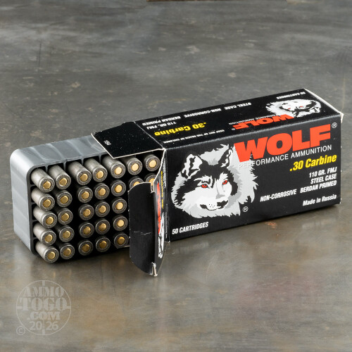 This is .30 Carbine Wolf 110gr FMJ ammo. This ammo has the polymer steel case and is non-corrosive. This is good plinking ammo. It comes packed in 50 rd. boxes, 1000rds. per case.