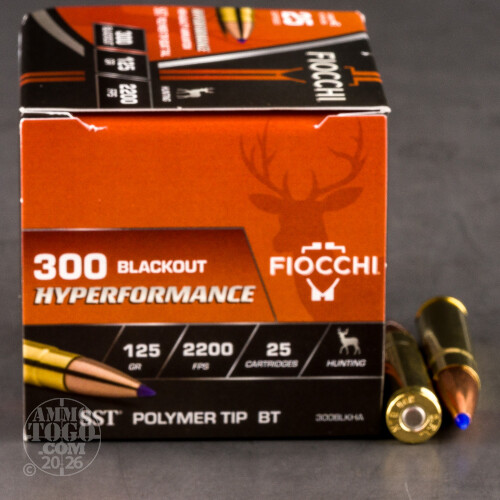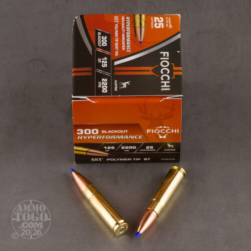 This versatile .300 AAC Blackout ammunition from Fiocchi can be used effectively for precision target shooting, hunting, and self defense. Each cartridge in this case of 500 fires a light 125 grain Hornady SST polymer-tipped hollow point bullet that delivers superb accuracy and high diameter expansion. With a muzzle velocity of 2,200 feet per second, this ammo delivers excellent medium-range performance compared to subsonic loads; however, the noise the bullet makes as it crosses the sound carrier cannot be mitigated by a suppressor. This ammo is loaded by Fiocchi of America in Ozark, Missouri and uses non-corrosive Boxer primers and reloadable brass cases.