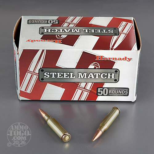 This is .308 Hornady 155gr. Steel Match Boattail Hollow Point Ammo. This Hornady .308 Steel Match ammo utilizes polymer coated steel cartridge cases and non corrosive berdan primers. Steel Match is loaded at the Hornady factory with optimized propellant for each load, providing consistency and the highest levels of accuracy. This ammo comes packed in 50rds. per box, 10 boxes per case.