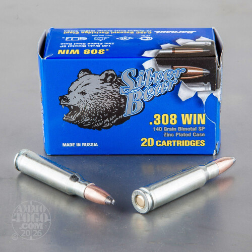 This is .308 Silver Bear 140gr. Soft Point Ammo. This ammo is manufactured by JSC Barnaul Machine-Tool Plant in Russia. Barnaul is considered to be the premier ammunition factory in Russia, and it supplies most of the ammo to the Russian Military. This ammo has a unique zinc plated steel case, which gives you all the characteristics of nickel plated brass, at a fraction of the cost. Since this ammo is Zinc plated, it functions much smoother than any other steel cased ammo. This ammo is 100% non-corrosive. It comes packed in 20rd boxes, 500rds. per case.