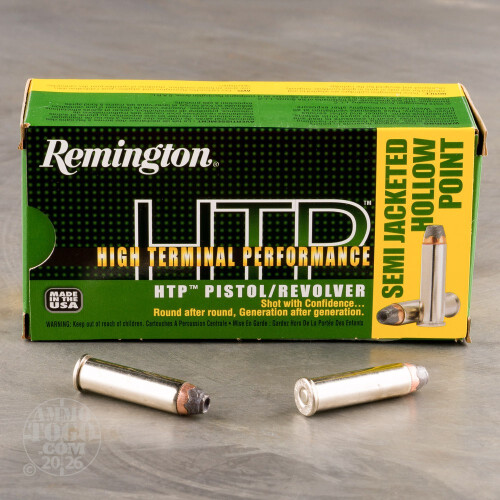 Load your favorite .357 Magnum revolver or lever-action rifle with these premium rounds for an optimal personal defense solution. These Remington High Terminal Performance (HTP) brand cartridges are constructed using reloadable brass casings which are nickel-coated for smooth cycling and fitted with non-corrosive Boxer primers. The HTP line is designed with high quality and excellent performance for protection and hunting in mind.Each cartridge uses a standard pressure charge behind a 158 grain Semi-Jacketed Hollow-Point (SJHP) projectile with a wave design in the jacket right above its cannelure crimp. This style of bullet promotes wide expansion at a variety of velocities while maintaining momentum and preventing jacket separation. The cannelure also prevents bullet setback in a tubular magazine as well as displacement in a cylinder due to recoil.