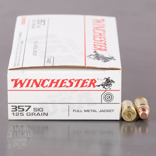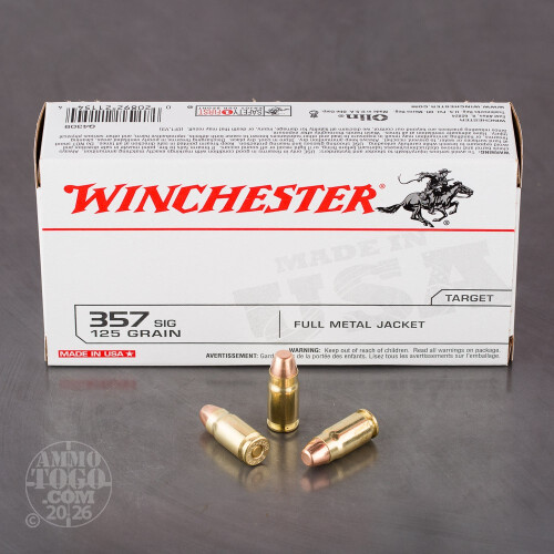 This is 357 Sig Winchester USA 125gr. Full Metal Jacket Ammo. It is brass cased and boxer primed. It is clean reliable ammo for target shooting. It comes packed in 50rd. boxes, 500rds. per case.