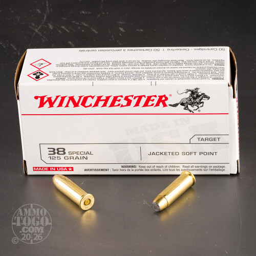 This is .38 Special Winchester 125gr. Jacketed Soft Point Ammo. Proven accuracy, notched design, solid nose design. This ammunition is new production, non-corrosive, boxer primed, reloadable brass cases. This ammo is packed in 50rd. boxes.