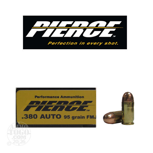 This is .380 Auto Pierce 95gr. Full Metal Jacket Ammo. Pierce Performance Handgun Ammunition is manufactured using the finest components available. Pierce rounds are guaranteed to meet and exceed your needs in any situation. Pierce - Perfection in every Shot. This ammo is brass cased, boxer primed, and non-corrosive. Muzzle velocity of 1050fps. This ammo comes packed in 50rd. boxes.