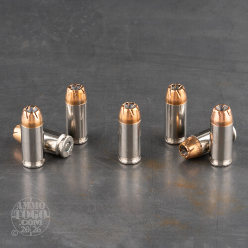 This factory fresh ammunition is non corrosive and boxer primed. The primer and mouth of each cartridge features special waterproofing for extra reliability, even in wet weather conditions. Cases are high-quality, reloadable, nickel-plated brass for high visibility and smooth feeding and function. Each round produces a consistent muzzle velocity of 1015 feet per second with 412 foot pounds of muzzle energy.