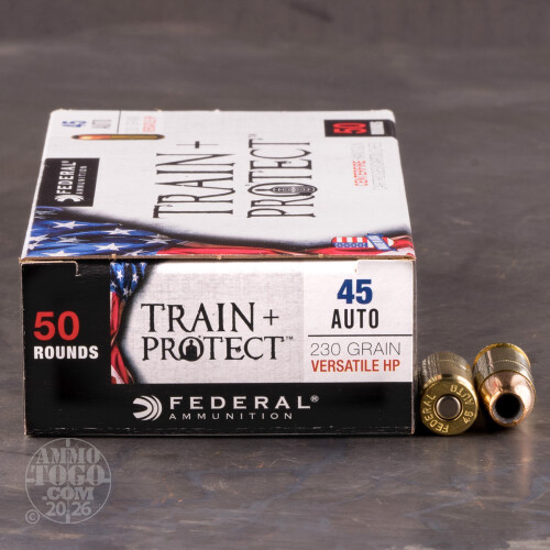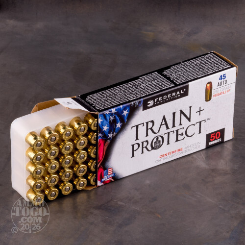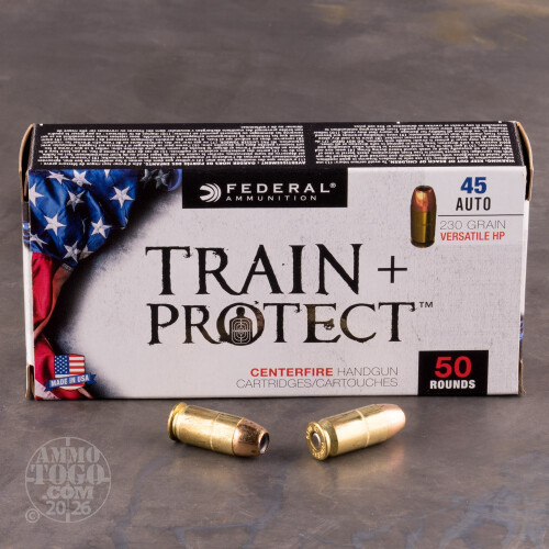 Federal has introduced the "Train + Protect" lineup of ammunition to help shooters save both time and money without compromising on their needs. This is accomplished by use of the VHP (versatile hollowpoint) projectile which is affordable but still highly functional in a personal defense role. This particular .45 ACP load uses a 230-grain VHP that produces strong penetration. The bullet's deep cavity, wide mouth, and skived jacket promote dependable expansion upon impact with a target. This helps create a wider wound cavity while avoiding lethal over-penetration at typical engagement distances.Each projectile is firmly crimped into a reloadable brass casing that's fitted with a clean-sparking Boxer primer. Federal ammunition is made in Minnesota utilizing production techniques that have been in constant refinement since 1922. The brand is well-recognized by shooters of all types for uniform quality and excellent performance.