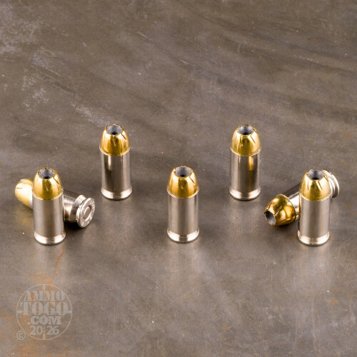 This 45 ACP round from Remington’s Golden Saber line of ammunition features a 230 grain projectile. The bullet’s jacket is somewhat uniquely made of brass rather than copper gilding metal -- this makes it harder so that it can pierce a variety of medium barriers, and further permits it to release superior energy over greater distances. During penetration, this bullet’s spiral cut serrations will help its large hollow point open up substantially, creating a wide and devastating wound channel while helping to prevent hazardous overpenetration.This is a hardy cartridge -- its mouth and primer are both waterproofed, and its casing’s nickel plating is intensely resistant to letting moisture corrode it. Its casing is also shiny, facilitating chamber checks in dim environments. Should you have to draw your weapon in the dark, then this round’s low flash propellant will help you dearly by not blinding you -- you’ll be able to fire multiple shots accurately.
