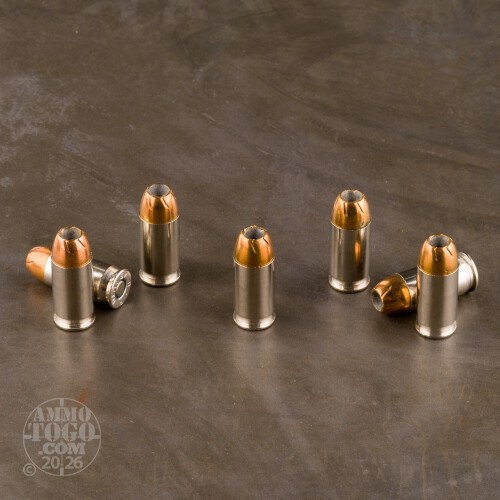 This is 45 ACP Remington Golden Saber Bonded 230gr. Brass Jacketed Hollow Point Ammo. The Golden Saber High Performance Bonded Jacketed Hollow Point handgun ammo showcases Remington's continuing advances in bullet technology. No other handgun cartridge offers so many high-performance features for home security and law enforcement applications. Some of these features include: A nickel plated case for smooth functioning in all types of handguns. An exclusive bonded brass bullet jacket which controls mushrooming and releases energy over a longer distance, compared to copper jacketed bullets. The nose cuts of the bullet go completely through the bullet jacket to enhance mushroom initiation over the widest ranges of practical velocities. The reduced nose diameter greatly increases accurracy over a wide range of distances. The primer and case mouth is sealed for moisture protection and the primers are triple checked during the manufacturing process, to ensure the most reliable functioning handgun ammo manufactured. The powders are treated with flash retardants to greatly decrease the amount of muzzle flash. This is a premium personal protection and law enforcement round. This ammo is packed in 50rd. boxes.