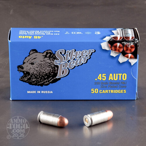 This is .45 ACP Silver Bear 230gr. Full Metal Jacket Ammo. This ammo is manufactured by JSC Barnaul Machine-Tool Plant in Russia. The Barnaul plant is considered the premier ammunition plant in Russia, and they supply the majority of the ammo to the Russian military. This ammo is 100% non-corrosive berdan primed, steel cased, and new factory ammo. It has a zinc plated steel case so you will not get a lacquer build up in your pistol. This ammo is packed in 50rd. boxes.