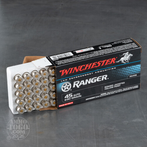 Winchester produces their Ranger Bonded ammunition for people whose line of work we don’t envy. At any moment a cop might have to engage a target that has taken cover behind any variety of barriers. But when they’ve got this 45 ACP round in their chamber, the odds are much better in their favor!.This cartridge features an extremely potent 230 grain projectile. The bullet’s bonded jacket and core are virtually inseparable from one another, and accordingly resist peeling apart and separating as they pass through a layer of wall board, sheet metal, or even auto glass. The bullet’s hollow point nose cavity is similarly barrier resistant, so it preserves its ability to expand rapidly immediately after making contact with its target. The result is a bullet that carves out a deep and wide wound channel, which is the kind of wound channel bad guys don’t quickly bounce back from.