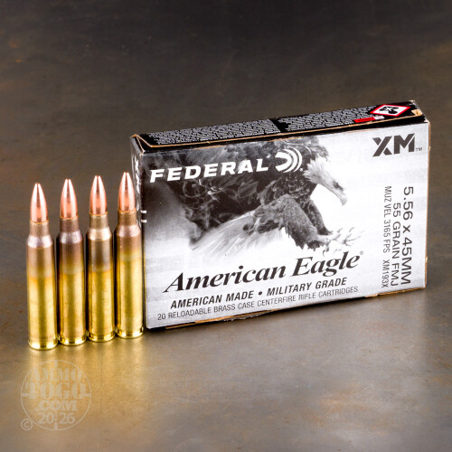 Are you running low on the 5.56x45 ammo you need to do your business at the rifle range? We hate to hear it! We really wish there was something we could do to help you – such as ship a fresh case of Federal Premium American Eagle 5.56 ammo directly to your doorstep!This is Federal’s own XM193 ammo, which is loaded according to military specs yet specifically manufactured for civilians. Each round is armed with a 55 grain bullet, with a nonmagnetic gilding metal jacket, solid lead core and angled boat tail that promotes flatter trajectories and provides better protection against crosswinds. The bullet additionally possesses a cannelure to help avoid setback during recoil.