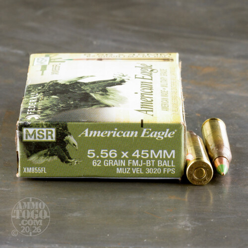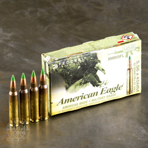 As an XM855, this 5.56x45mm round from Federal sports a green tip that indicates its 62 grain projectile’s steel core. The “penetrator” bullet soundly lives up to its name, as it’s able to punch through a variety of rugged barriers en route to its final destination -- not exactly what you’d want to use to shoot steel targets, unless you’re about to retire them, but certainly satisfying for plinking with items you’ve hauled away from or are destined for the junkyard.In spite of American Eagle’s agreeable price tag, this round is laden with features which improve its performance. Its bullet’s full metal jacket even further enhances its ability to penetrate a variety of media, and helps to maintain your accuracy by doing away with lead fouling. The bullet also sports a tapered base, which improves its ballistic coefficient and accordingly its accuracy and resistance to wind drift. You’ll be able to keep this case of ammo in play for a long time thanks to its brass casings, each of which may be reloaded multiple times if you’ve the reloading bench necessary for the exercise.