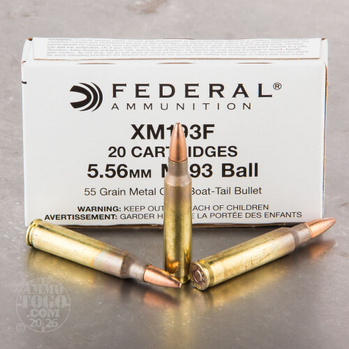This is Federal Lake City 5.56 XM193F 55gr. FMJ ammo. This ammo was manufactured by Lake City and is manufactured to U.S. Military M-193 specs. This is considered to be the best 5.56 55gr. ammo money can buy. It is brass cased, boxer primed, and 100% non-corrosive. It is packed in the white military style 20rd. boxes, 500rds per case.