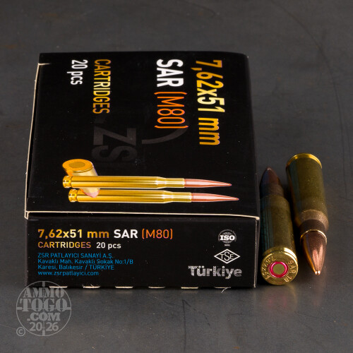 ZSR Patlayıcı Sanayi is headquartered in the nation of Turkey, and they make everything from less lethal shotgun shells to big bags of straight-up explosives. Naturally they specialize in producing the most popular metallic cartridges for warfare, such as this fine 7.62x51 range ammo you see here!This is M80 spec ammo, with 147 grain FMJ bullets. These simple projectiles feature nonmagnetic copper alloy jackets and lead cores, so they’re fit for duty at all commercial ranges. The bullet’s jacket cannelure helps prevent setback in the magazine, and its approximate muzzle velocity of 2,800 fps gives it external ballistics you’re sure to find real familiar if you’re already a fan of this caliber.