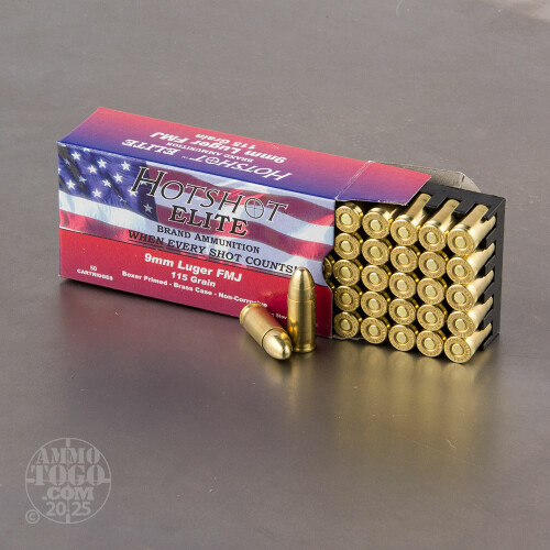 This is 9mm Luger Hotshot Elite 115gr. Full Metal Jacket Ammo. Slovak Republic manufacture. This ammo is brass cased, boxer primed, and non corrosive. This ammo comes packaged 50rds to a box.