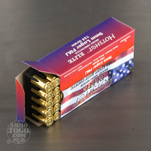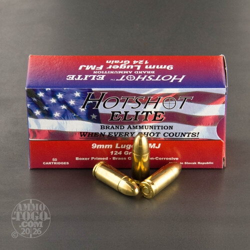 This is 9mm Luger Hotshot Elite 124gr. Full Metal Jacket Ammo. Slovak Republic manufacture. This ammo is brass cased, boxer primed, and non corrosive. This ammo come packaged 50rds to a box.