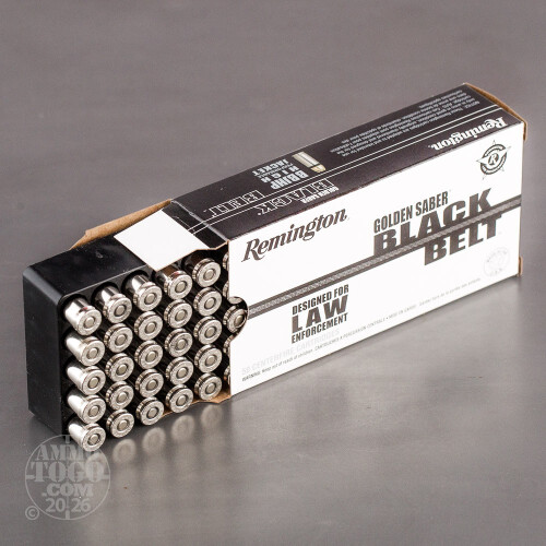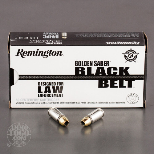 This is 9x19mm +P Remington 124gr. Golden Saber Black Belt ammunition. The "Black Belt" refers to an all-new Mechani-Lokt band which improves on the old Golden Saber design with increased penetration and barrier defeating properties. The bullet jackets are made of brass to withstand the +P pressure. This ammunition was previously only available to law enforcement but is now offered to all shooters. The ammo is brass cased, non-corrosive, and comes in a bulk pack of 500 rounds.-