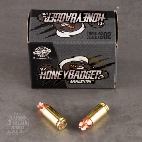 Harness the power of copper for self-defense. Order your case of Black Hills 9mm +P 100 grain HoneyBadger ammunition today! These South Dakota-made cartridges pack a little extra punch that makes them unsuitable for certain older firearms, but their high-tech bullets are truly effective at their intended application.The HoneyBadger is not a jacketed hollow point. It hasn’t got a nose cavity at all, as a matter of fact, which is why it won’t fill up with debris before it reaches the threat. At that point the bullet’s unique nose profile channels hydraulic energy inward and then outward at high velocity. That produces a massive wound channel – easily double to quadruple the HoneyBadger’s 0.355” diameter. The solid copper bullet doesn’t splinter apart as it penetrates barriers or soft tissue, so it reliably conserves the momentum it requires to penetrate to an effective depth for defensive applications.
