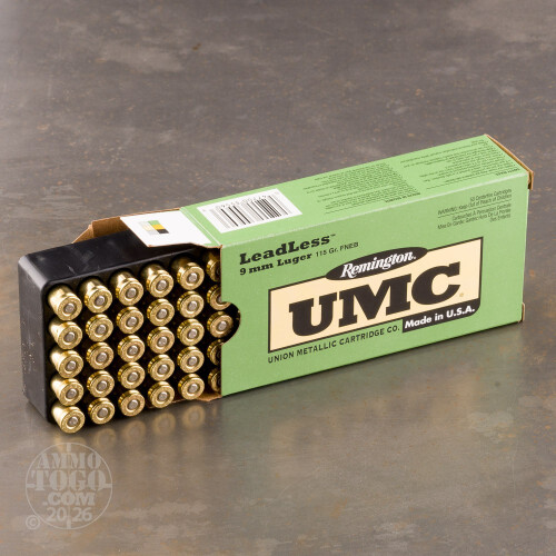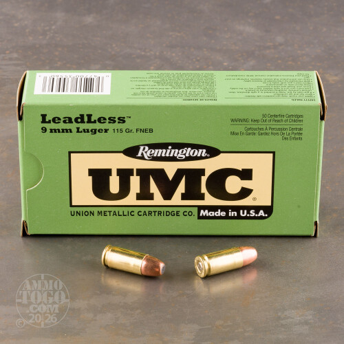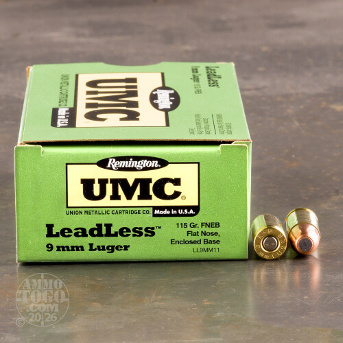 This is 9mm Remington UMC 115gr. Flat Nose Enclosed Base (FNEB) Leadless Ammo. This is a must-have for shooters that frequent indoor ranges, UMC LeadLess cartridges virtually eliminate lead exposure at the firing line. The specially designed Flat Nose Enclosed Base (FNEB) bullet actually prevents the vaporization of lead from the bullet’s base upon firing. Also, these cartridges feature the industry’s best heavy-metal-free primer. The standard bullet weights duplicate the ballistics of conventional loads. Like all other UMC offerings, the LeadLess UMC cartridges offer a truly economical value for high-volume shooters without any compromise in quality or performance. This ammo is packed in 50rd. boxes, 500rds. per case.