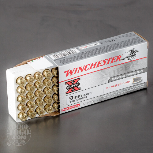 This is 9mm Winchester 115gr. Silvertip Hollow Point Ammo. Winchester Super-X Silvertip Ammo offers a unique combination of power, precision, reliable functioning and on-target performance, via a specially engineered jacketed bullet. This bullet delivers penetration and rapid energy release with virtually no weight loss or bullet fragmentation. This is the recommended ammo of many handgun manufacturers, due to its reliable functioning. It is a tried and true hollow point for self defense. This ammo is packed in 50rd. boxes.