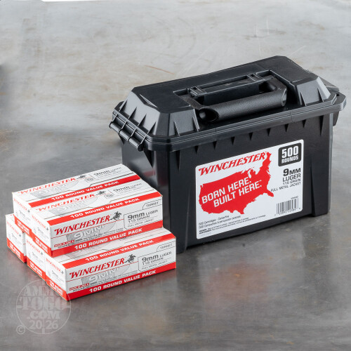 500rds – 9mm Winchester USA 115gr. FMJ Ammo in Field Box Details