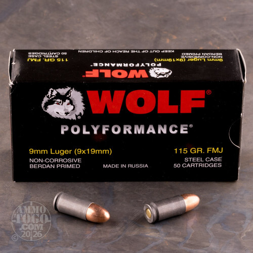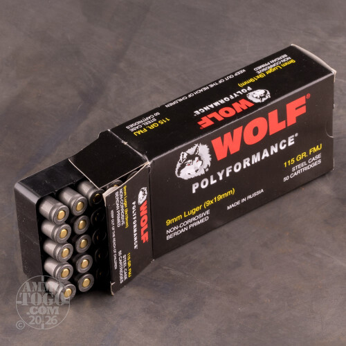 Wolf 9mm ammo is one of the most economical choices you can make if you've got a range trip planned for training or plinking. Formally known as Wolf Performance Ammunition. These rounds are part of Wolf's Polyformance series and is a 115 grain, full metal jacket Ammo. This bulk ammunition is manufactured in Russia. Each round is Berdan primed, non-corrosive, featuring a polymer steel case sealed for moisture protection. It comes packed in 50 round boxes so you'll get 10 boxes ready to take with you on your next range trip if you order today.