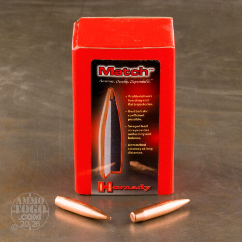 These are 338 Cal .338 Dia Hornady Match 285gr. Boat Tail Hollow Point Bullets. Hornady's commitment to precision manufacturing produces some of the best ammo and components out there, and these 338 Cal 285gr. BTHP bullets are no exception. These bullets are considered match grade, with Hornady's AMP (Advanced Manufacturing Process) jacket and a high ballistic coefficient. The AMP jacket provides one of the most consistently concentric jackets available, with very little to no jacket thickness variation. Combined with a swaged lead core and Hornady's strict quality standards, these bullets give accuracy a whole new meaning. Now you use the same high quality components that make Hornady's ammo world-class in your own loads. Hornady does not recommend their match bullets for hunting. These bullets come packaged in 50rd. boxes. Bullet Diameter: .338 Ballistic Coefficient (G1) .700 Ballistic Coefficient (G7) .352 Sectional Density .356