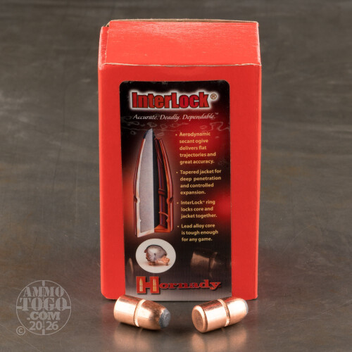 These are 45 Cal .458" Dia Hornady Interlock 350gr. Flat Point Bullets. The aerodynamic secant ogive of the Hornady InterLock delivers flat trajectories and great accuracy. It's tapered jacket allows for deep penetration and controlled expansion while the InterLock ring locks core and jacket together. These bullets come packaged 50pcs. to a box.