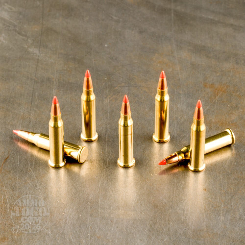Federal American eagle 20 gr. polymer tip ammo The first time I used these I put 3 of them into 1/2 inch @ 100 yards.You might not think that to be unusual,but my new ruger was delivered with a trigger closer to 6# then it was to 5.Since attending to that I have one group of three under .300...ok so it's accurate.Lets talk about field performance.Ground squirrels were traumatically disassembled as though hit w/223.Hits were recorded out to 200 yards.What WAS unusual was that virtually ANY hit anywhere on the torso would kill almost immediately by shock...a 22 hit there would send them running!